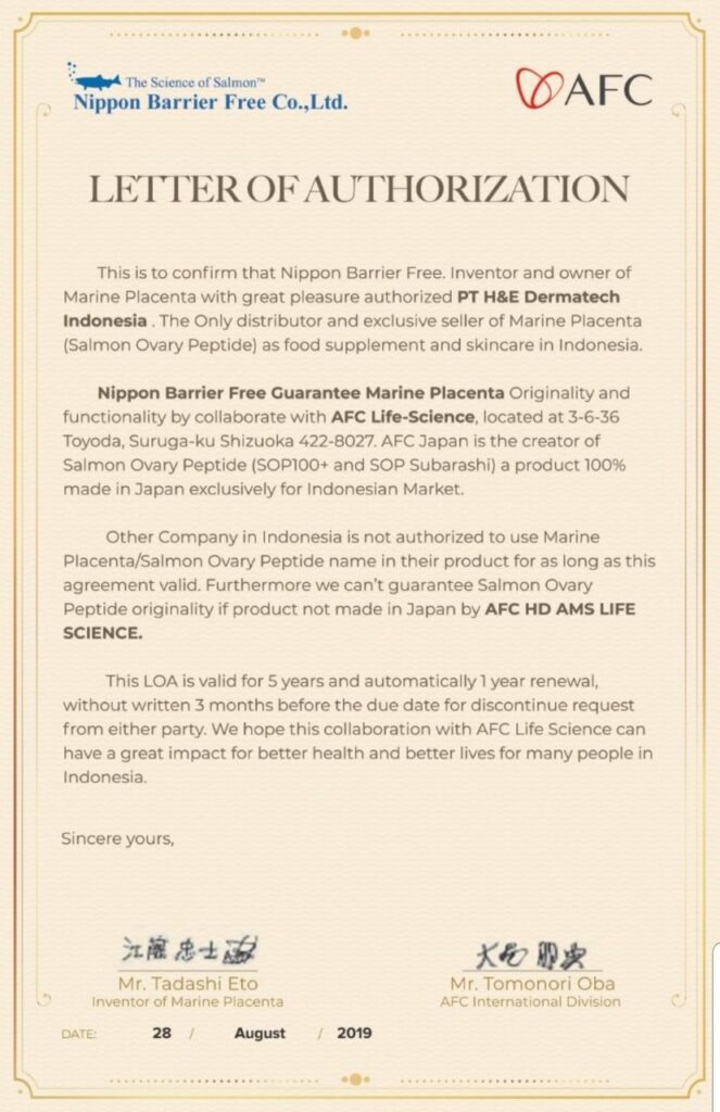 Letter of Authorization – Pemberian hak eksklusif kepada PT. H&E Dermatech Indonesia untuk menjadi satu-satunya distributor Salmon Ovary Peptide di Indonesia