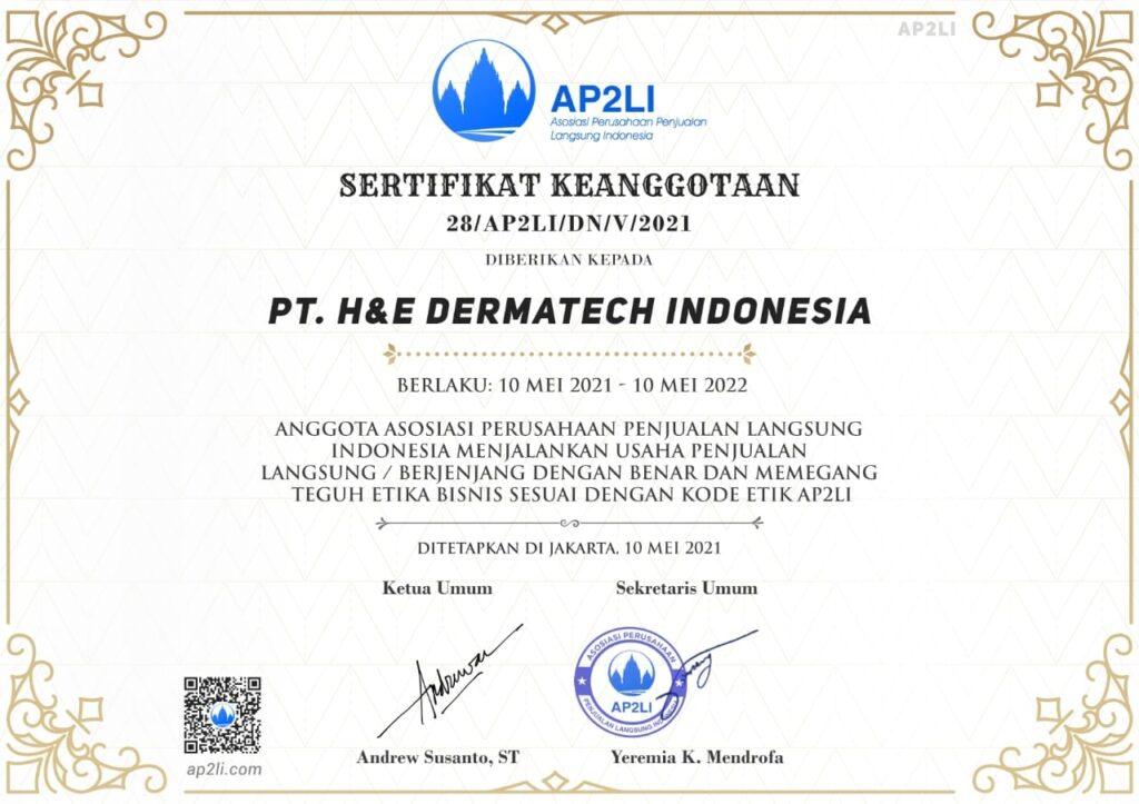 Terdaftar di Asosiasi Perusahaan Penjualan Langsung Indonesia (AP2LI) sebagai salah satu anggota resmi untuk menjalankan usaha penjualan langsung di Indonesia.