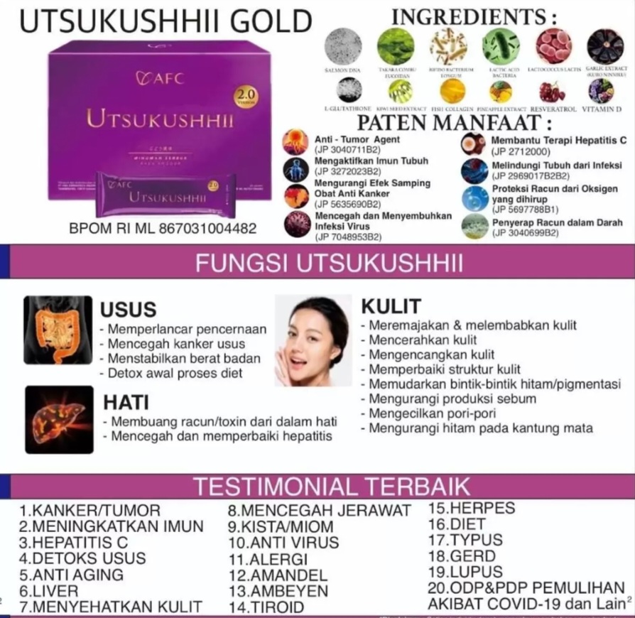 Utsukushhii Gold memiliki 8 paten manfaat di negara Jepang dan USA: